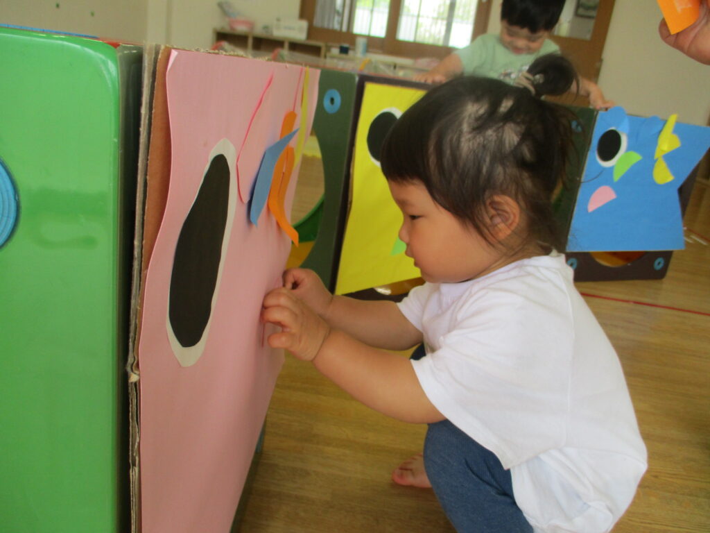 もう一つ、こいのぼりを壁にくっつける遊びもしました。