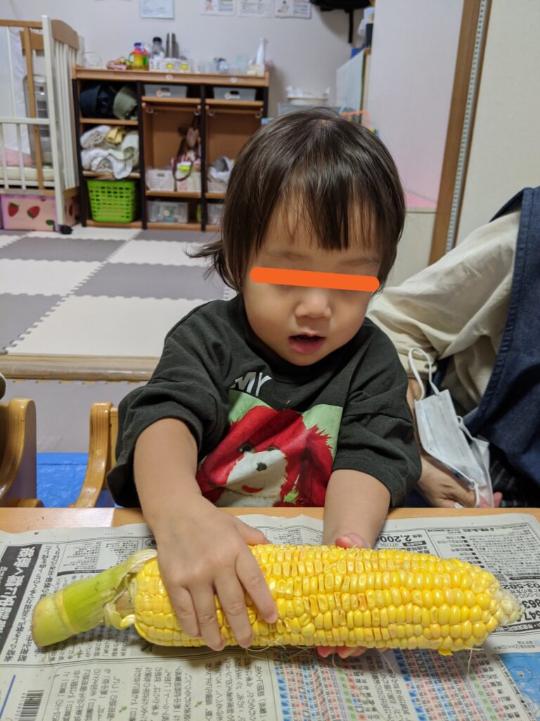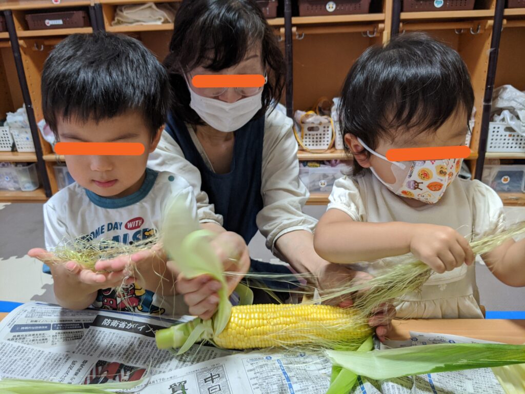 やっとトウモロコシが見えるとみんなとっても嬉しそう♪たくさん皮をむいたので達成感に満ちた表情の子どもたちでした。