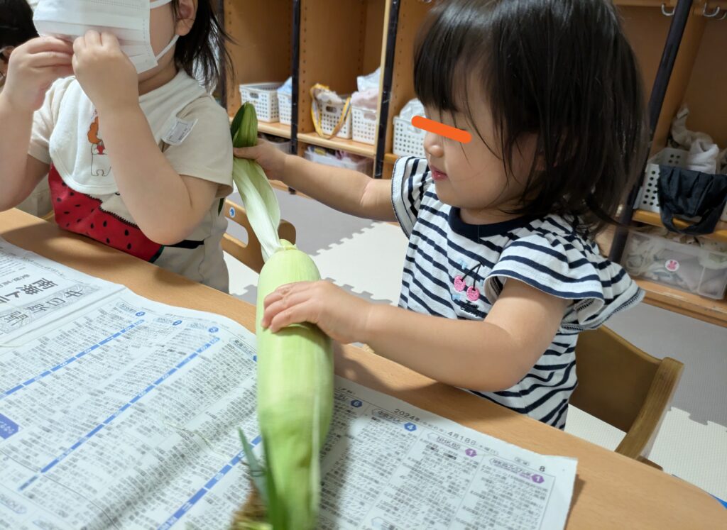 給食で食べるように届けてもらったトウモロコシを自分たちでむいてみることからやってみました。