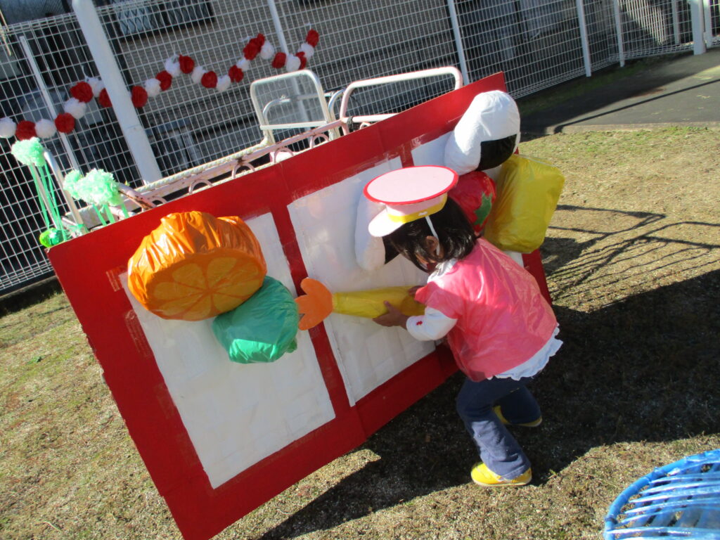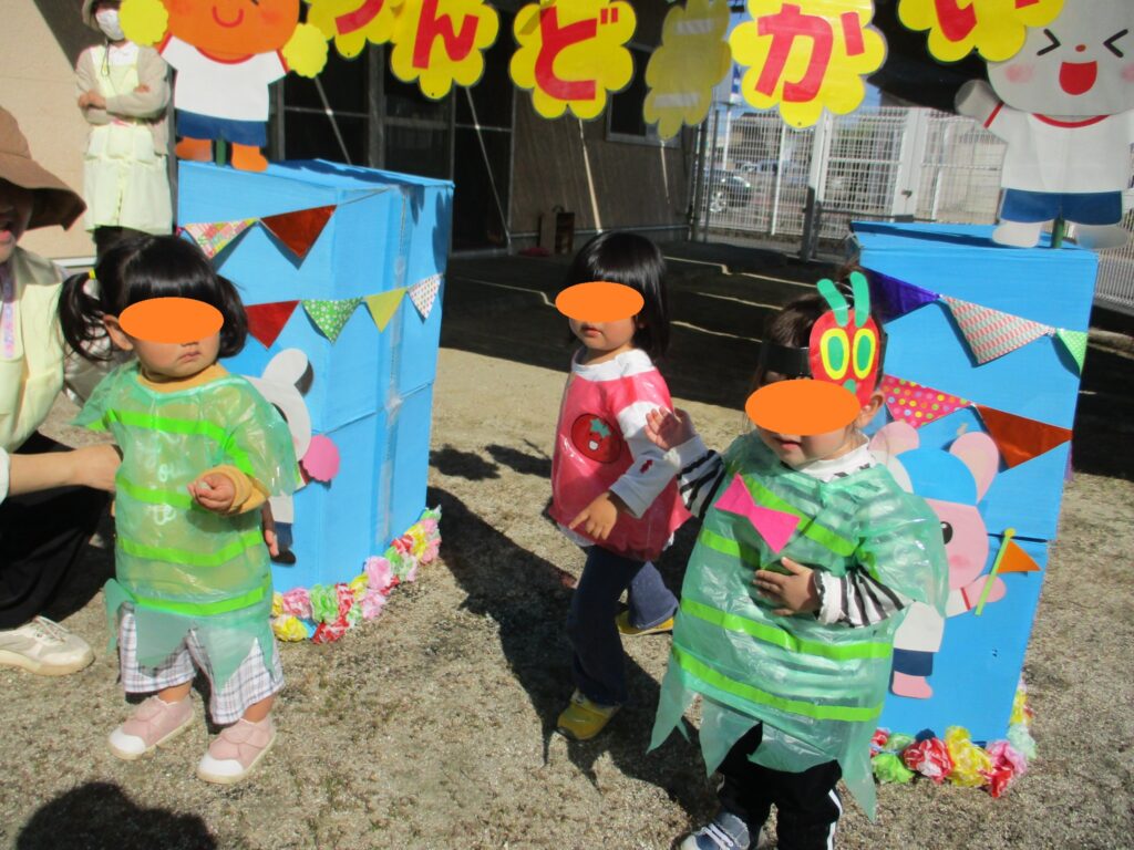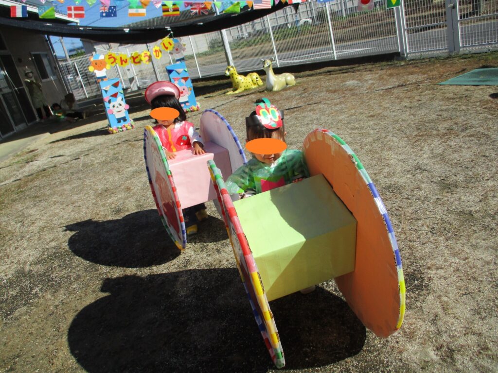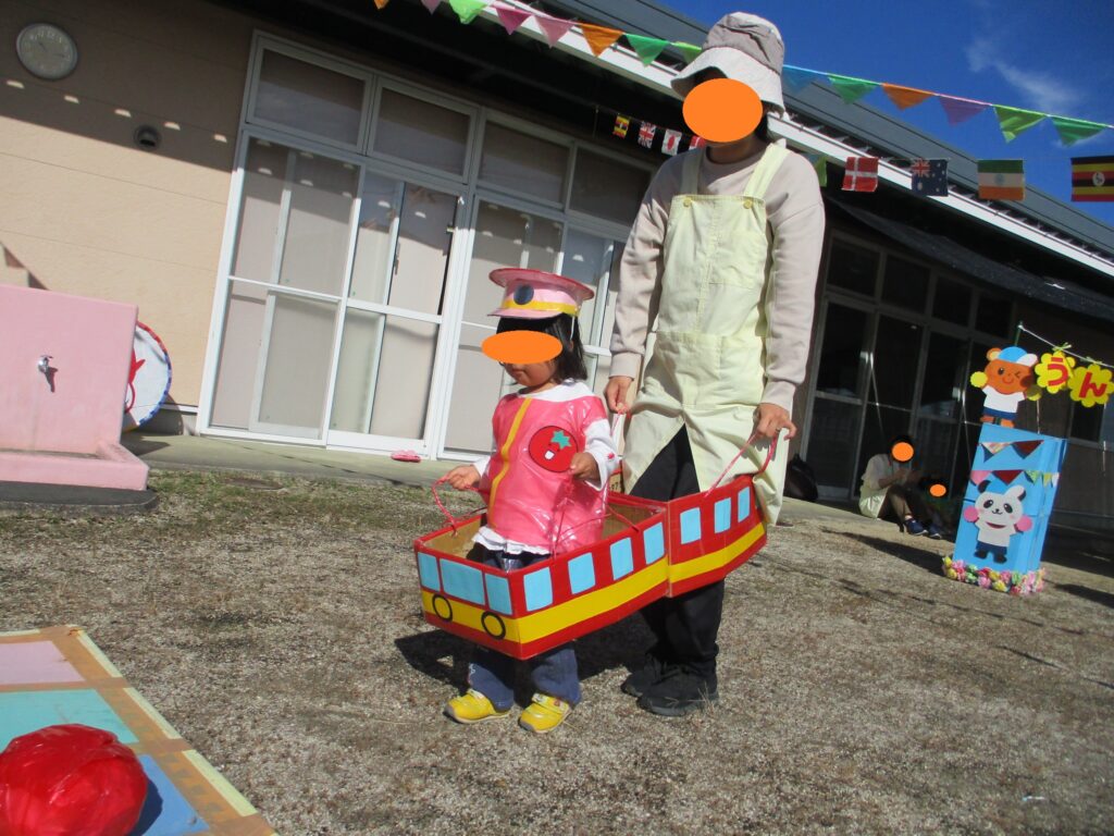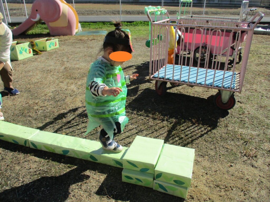 2歳児さんは絵本の“おべんとうバス”をモチーフにした競技をしました。