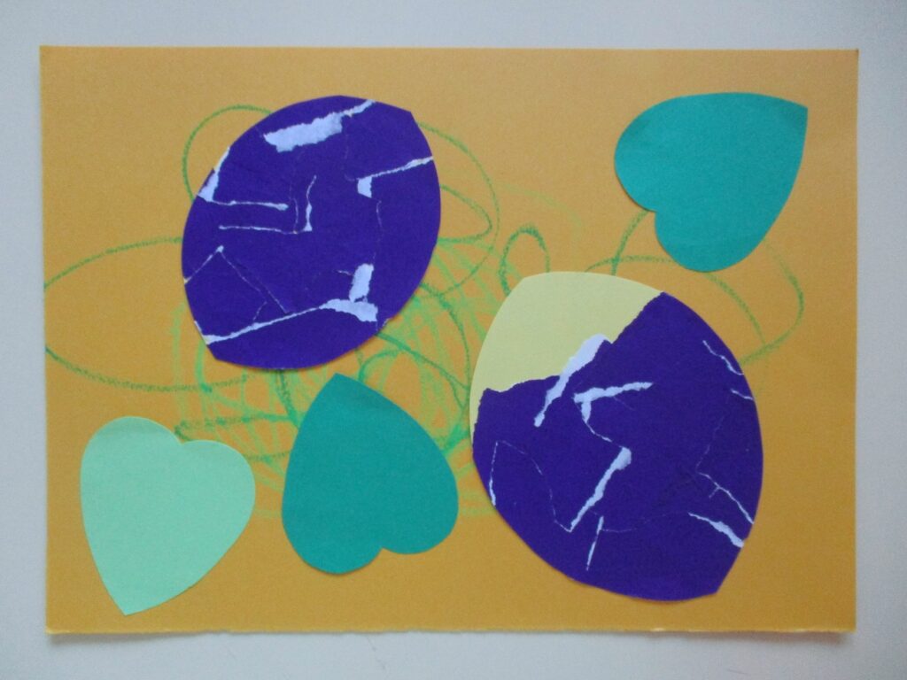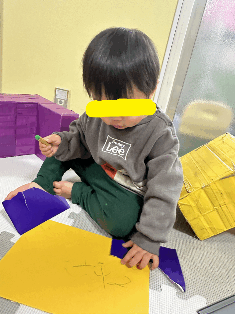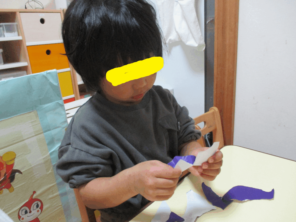 おりがみをビリビリ破っています。両手で上手にちぎることができますね。