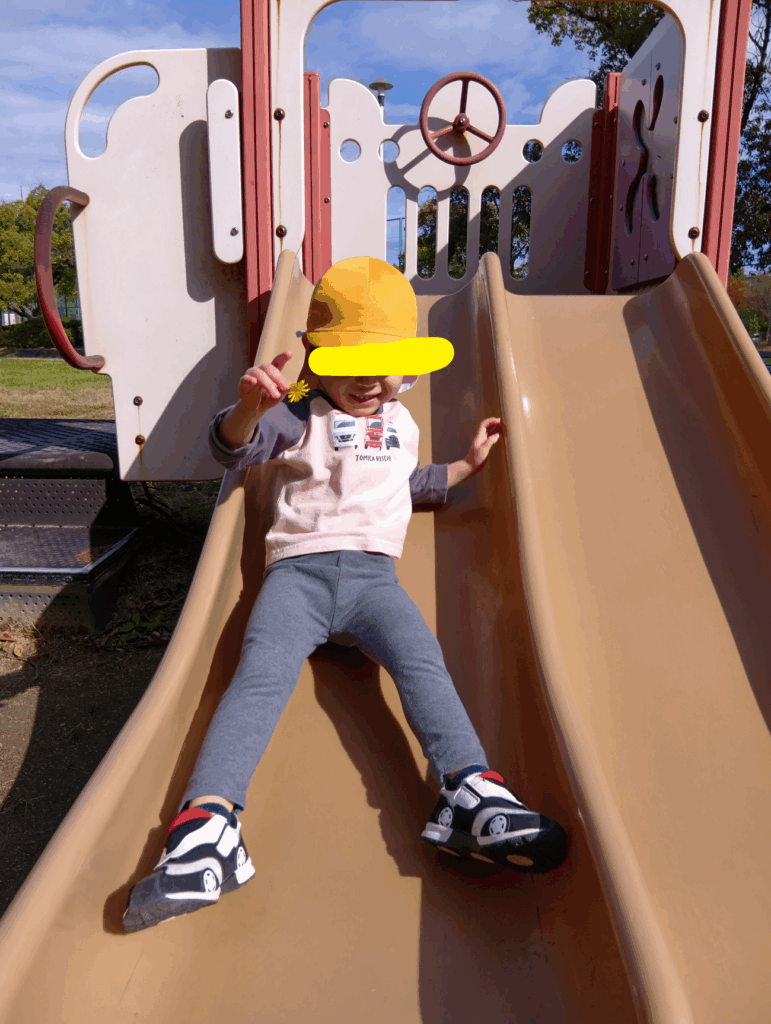 シューっと上から滑ってきたきりん組さん。カッコイイきりん組さんを見て、りす組のお友だちも真似っこします。そして、できることがどんどん増えています。手には黄色いタンポポ…まだ咲いていたんだね。