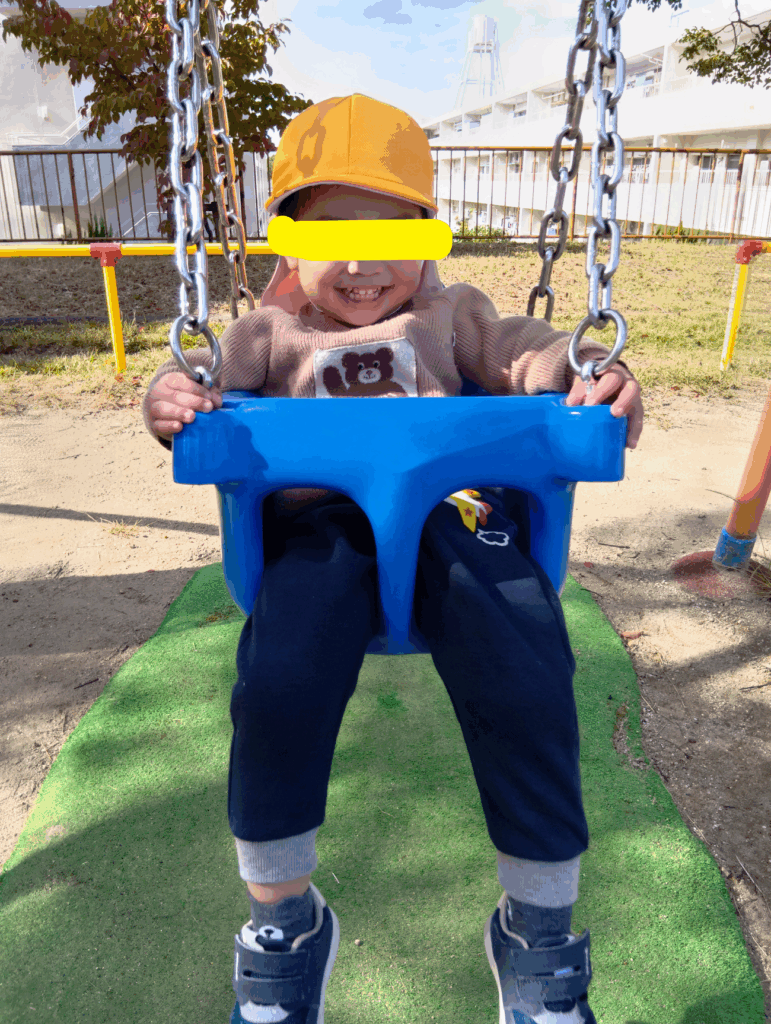 とっても可愛い笑顔を見せてくれます。ブランコだ~いすき♡「おまけのおまけの汽車ポッポー♫ポーっと鳴ったらかわりましょ!ポッポー♪」さあ、次のお友だちと代わってくれるかな?