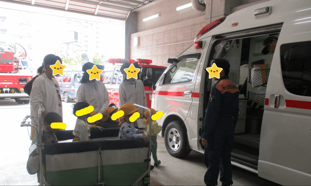 次は、お兄さんが救急車の説明をしてくれました。散歩中に救急車を見かけると「ケガしちゃったかな~?いたいいたいかな~?」と心配している時もあります。近くで見ることができて、嬉しそうでした。