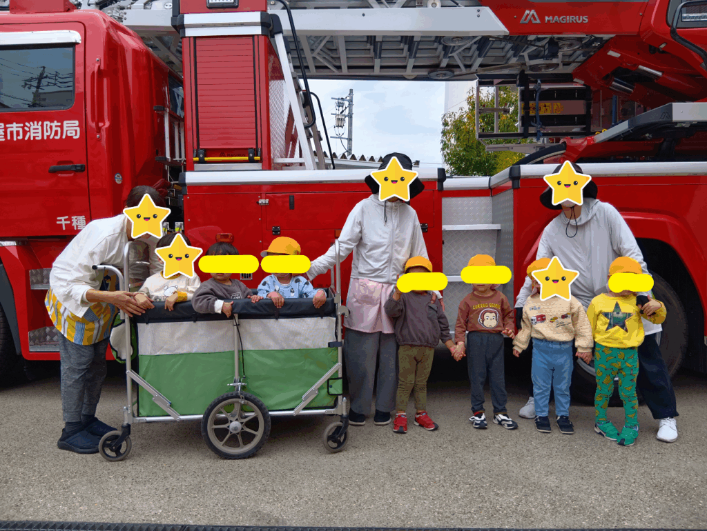 いつも散歩コースで前を通らせてもらっている千種消防署。1年に一回、見学させていただきます。火災現場で使う大きな照明や、煙を吸い込む大きな機械をのせた消防車を、お姉さんに説明してもらいました。「これ、なにー?」きりん組さんは、お姉さんに質問もしていました。