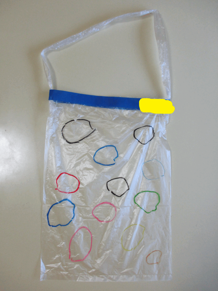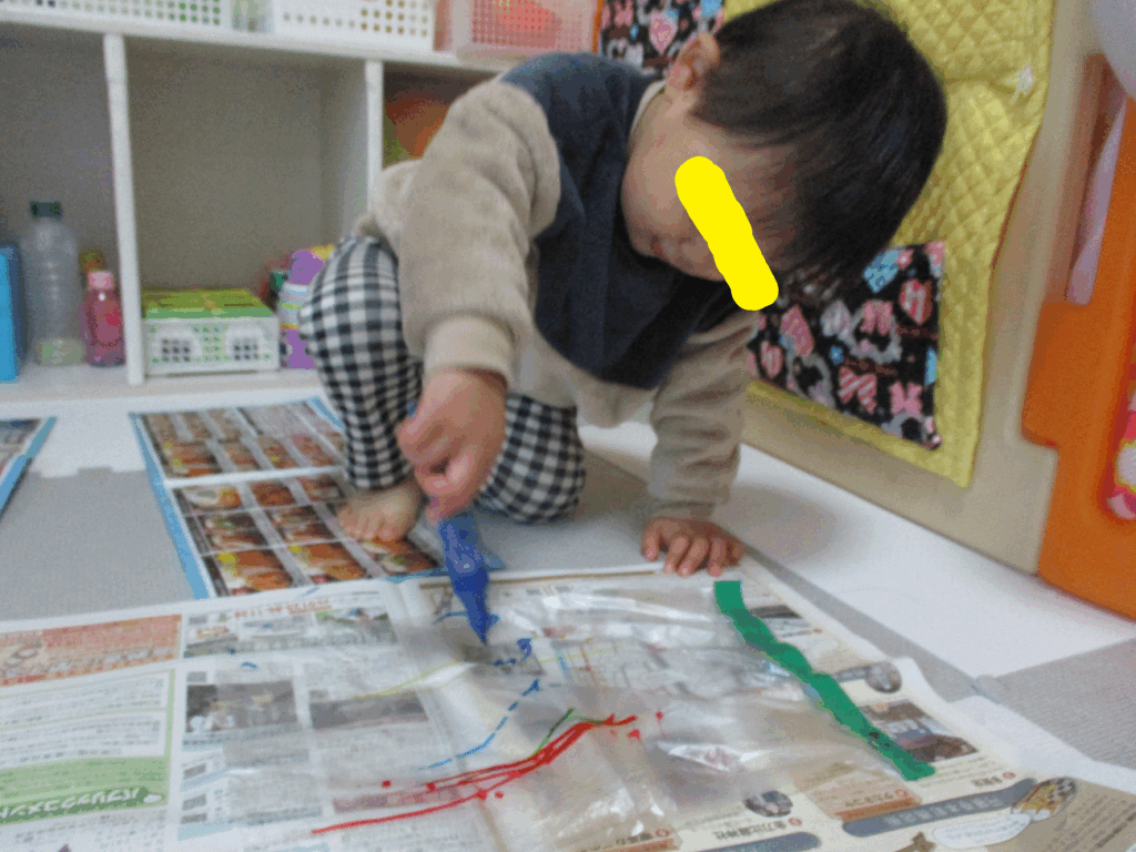年末、ビニール袋に油性ペンでお絵描きしました。自分の凧を作っています。