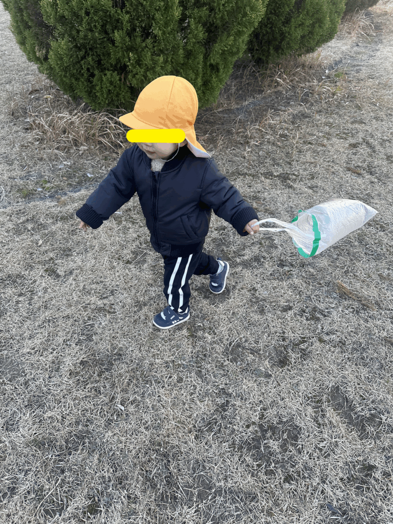 団地内広場で凧を持って走っています!ビニール袋に空気が入って膨らむのが、面白いです。後日、紐を長くしてバージョンアップしてきた子もいましたよ。遊びが展開していくのは、楽しいですね。