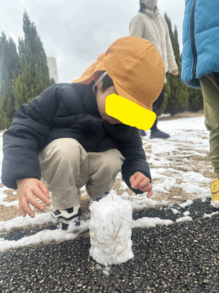 担任の真似をして、きりん組さんが地面に積もった雪を転がしたら…雪の塔が出来ましたよ。